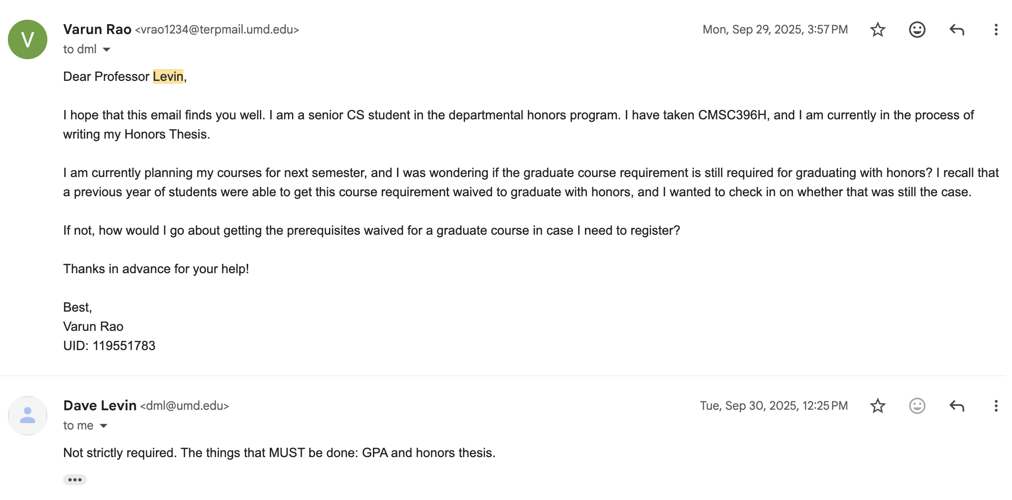 Dear Erin, Thank you for letting me know. Below, I have attached a screenshot of the full email correspondence between me and Dr. Levin from earlier last semester: [image: image.png] I have also forwarded the email in a separate thread for your reference. Please let me know about your decision whenever possible. Best, Varun Rao On Fri, Mar 6, 2026 at 2:29 PM Erin Molloy <ekmolloy@umd.edu> wrote:
